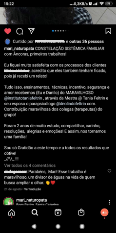 “[...] O curso foi só um começo. Sinto-me feliz de ter tido coragem de começar a atuar como Constelador e de, mesmo antes do curso terminar, já ter ajudado 5 clientes que, dias depois, voltaram para participar em outras constelações, trouxeram outras pessoas e relataram melhoras significativas nas dificuldades que constelaram.