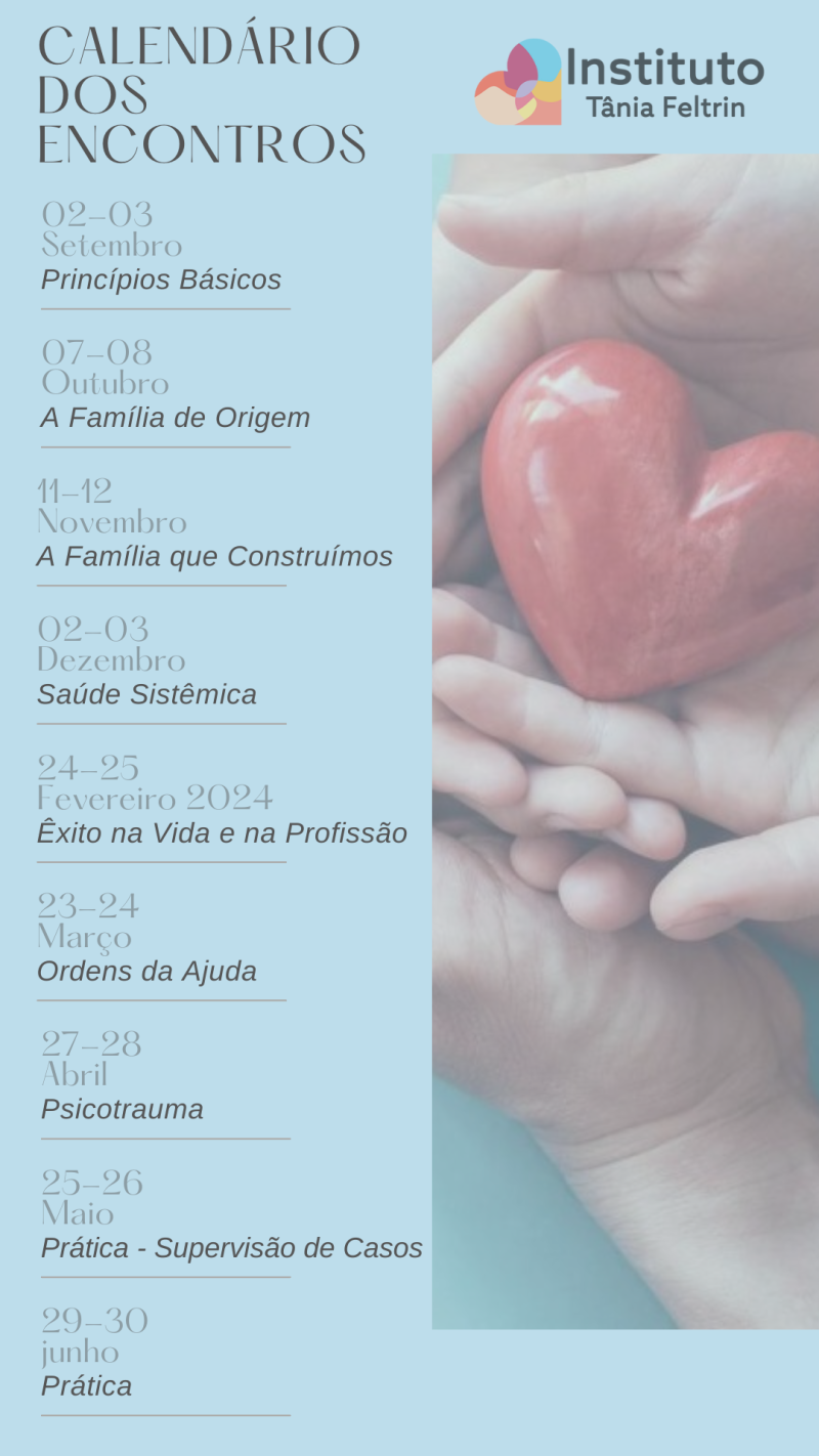 Curso teórico e prático com estudo dirigido, apostila, vídeos, leitura de livros e participação obrigatória em workshops e/ou eventos relacionados com a constelação familiar sistêmica.